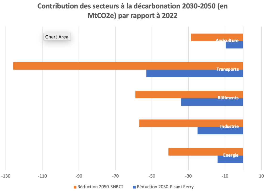 On voit que le secteur le plus fortement mis à contribution sera celui des transports (à l’horizon 2050 comme à l’horizon 2030), suivi par celui des bâtiments et de l’industrie à part égale, puis plus loin par l’énergie, et enfin l’agriculture.