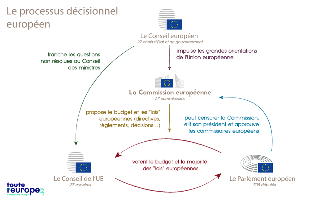 La Commission : composée de fonctionnaires dirigés par 27 Commissaires (un par Etat membre) nommés pour cinq ans et approuvés (ou non) par le Parlement10, dont sa présidente actuelle, l’Allemande Ursula von der Leyen (depuis 2019), elle est l’exécutif de l’UE, mais a aussi pour principale fonction l’initiative des textes de loi. Elle lance le processus législatif en proposant des mesures dans l’ensemble des domaines de compétence de l’UE. Elle propose également chaque année le budget de l’UE. Les propositions de la Commission sont ensuite amendées, approuvées ou rejetées par le Parlement et le Conseil de l’Union européenne.