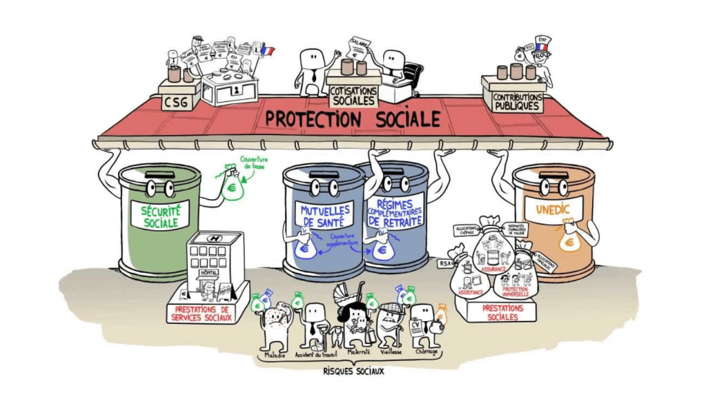 lyses sur longue période et des comparaisons européennes. Source : DREES. ↩︎ - Les « risques sociaux » (qui ne sont pas d’ailleurs tous des risques, sauf à considérer qu’avoir des enfants ou se loger est un risque) couverts incluent : vieillesse-survie, maladie, famille, logement, invalidité et AT-MP (accidents du travail et maladies professionnelles), emploi, pauvreté et exclusion sociale. ↩︎