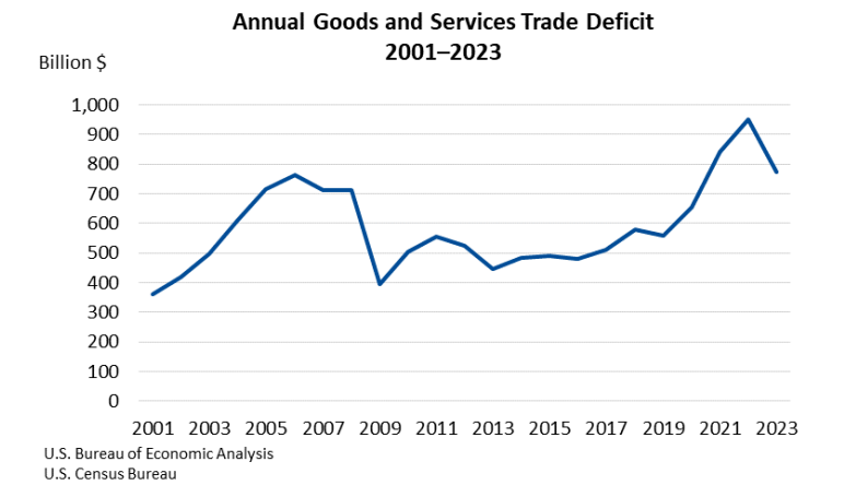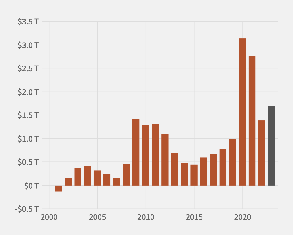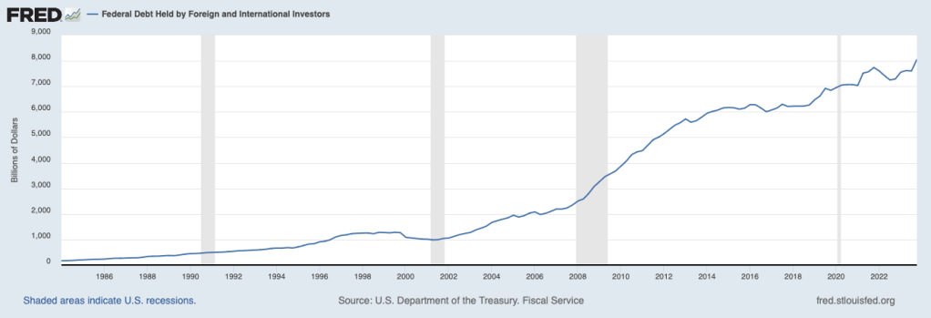 Une autre raison est l’affaiblissement économique des Etats-Unis, nonobstant leur forte croissance, qu’attestent entre autres, un déficit commercial (figure 1) et un déficit budgétaire (figure 2) abyssaux. Une conséquence, c’est l’explosion de la dette fédérale américaine détenue par des étrangers (figure 3), passée en 40 ans (1984-2023) de quelque 170 à plus de 8.000 milliards de dollars, soit de 1% à 29% du PIB !