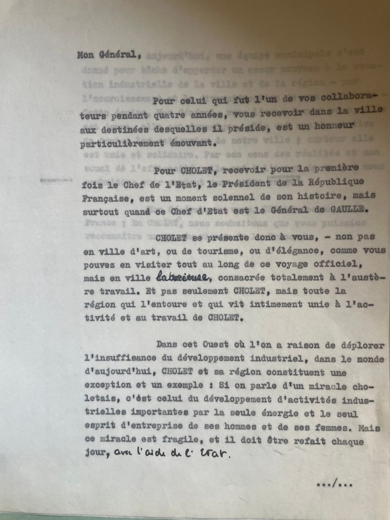 Le maire de Cholet prend d’abord la parole. Il dit l’ « honneur particulièrement émouvant » qu’il ressent à recevoir à Cholet celui dont il fut le collaborateur pendant quatre années 10. Il souligne ce qui fait, selon lui, la singularité de Cholet, d’être une « ville laborieuse, consacrée totalement à l’austère travail ». Il interprète le « miracle choletais » comme étant « celui du développement d’activités industrielles importantes par la seule énergie et le seul esprit d’entreprises de ses hommes et de ses femmes. » (figure 8)