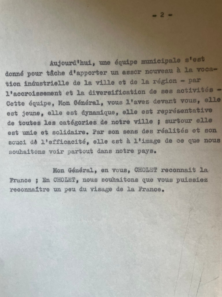 Le Général s’élance alors et commence par saluer « cette preuve magnifique d’unité nationale que Cholet offre aujourd’hui à la région, à l’Anjou, à la France ». Son discours, par ailleurs assez plat à l’aune de ses standards habituels, est une sorte de résumé de la politique nationale qu’il conduit pour façonner « notre destin », et qui consiste dans le triptyque : prospérité, solidarité et paix. A propos de cette dernière, il souligne « le rôle exemplaire » d’une France indépendante, et notamment par rapport à la « double hégémonie (des) deux puissances colossales », qui à l’époque dominaient le monde 11.