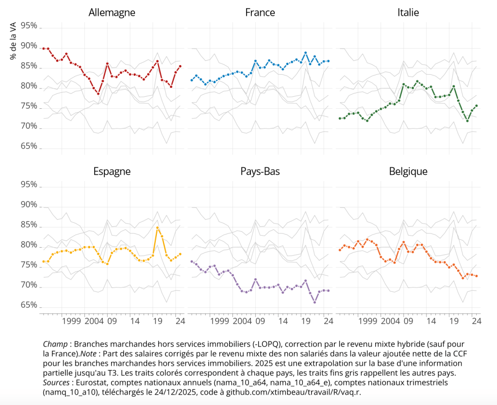 La part des salaires dans la valeur ajoutée ainsi définie est croissante en France (de 5,7 points entre 1998, le point bas, et 2024) alors qu’elle est stable (Italie) ou décroissante (Espagne, Allemagne, Pays-Bas et Belgique).