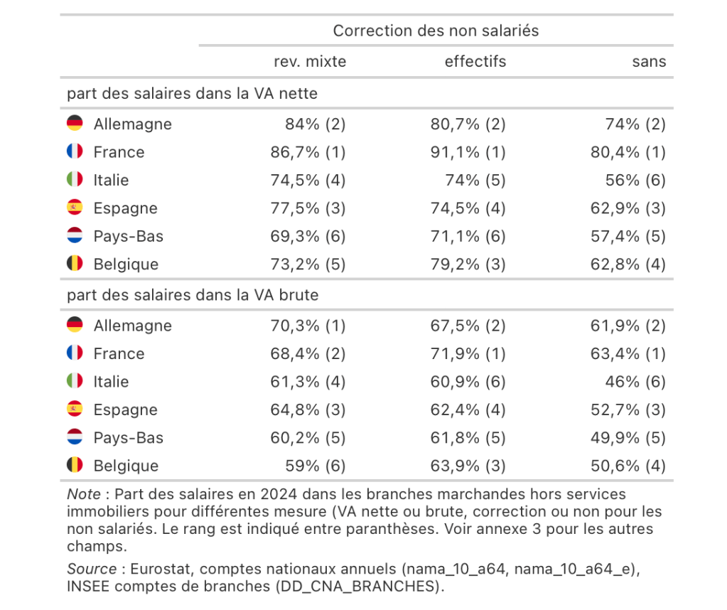 - Dans une note de mai 2025, la Direction du Trésor soutient que « sur les trente dernières années, la part des dépenses liées au travail dans la valeur ajoutée des sociétés non financières a été relativement stable, autour des deux tiers ». ↩︎