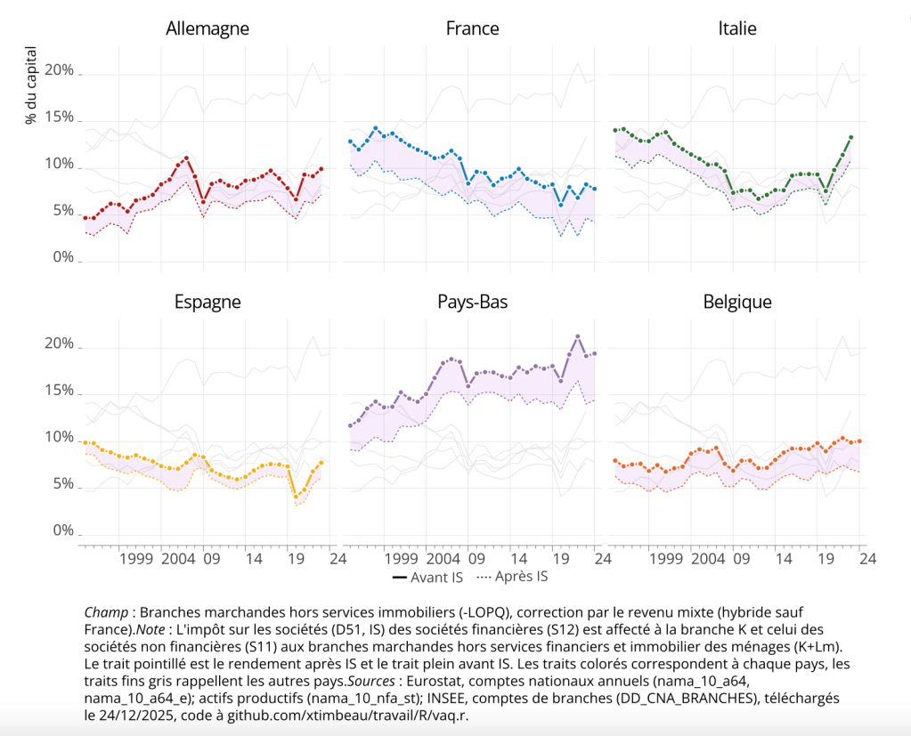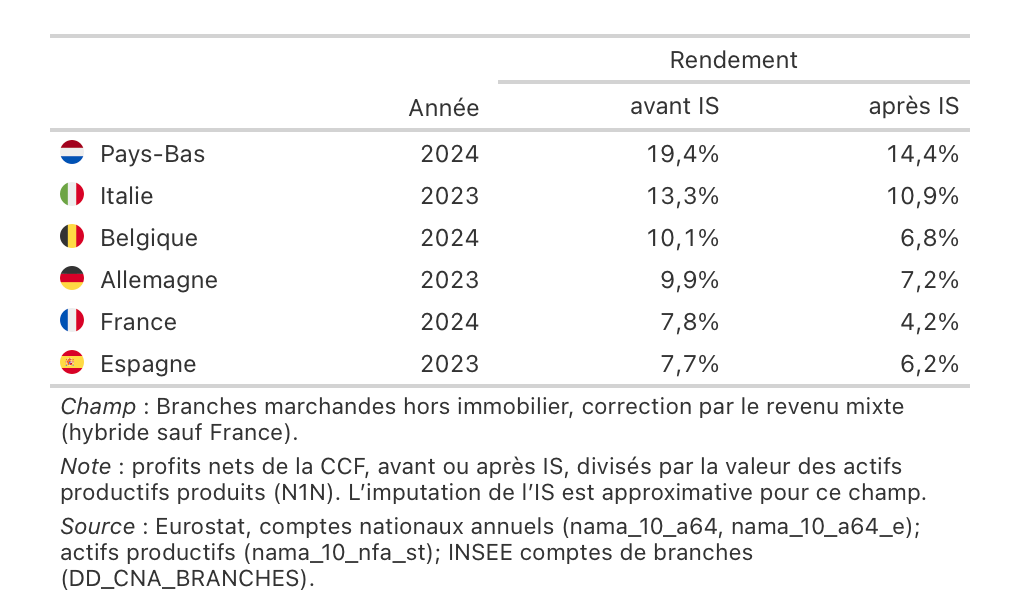 Corrélativement, la France se singularise par un rendement du capital productif particulièrement faible (cf. figure ci-dessous). A moins de 5% après impôt sur les sociétés (IS), il est inférieur de 10 points à celui de l’Allemagne (!), et équivalent à celui mesuré en Espagne (pour l’année 2023) avant IS, mais en tenant compte d’un IS effectif plus élevé, le rendement après IS est plus nettement plus bas en France.