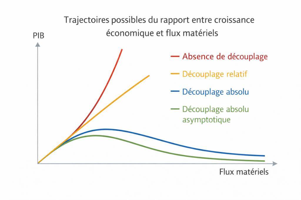Toutes les dynamiques de découplage ne sont pas équivalentes du point de vue biophysique. L’absence de découplage conduit à une augmentation parallèle du PIB et des flux matériels. Le découplage relatif correspond à une croissance des flux plus lente que celle du PIB, mais reste incompatible avec des contraintes environnementales strictes si la croissance se prolonge. Le découplage absolu implique une stabilisation puis une diminution des flux en valeur absolue. Le découplage absolu asymptotique décrit une trajectoire dans laquelle les flux décroissent et convergent vers un niveau compatible avec les contraintes biophysiques sans le dépasser.