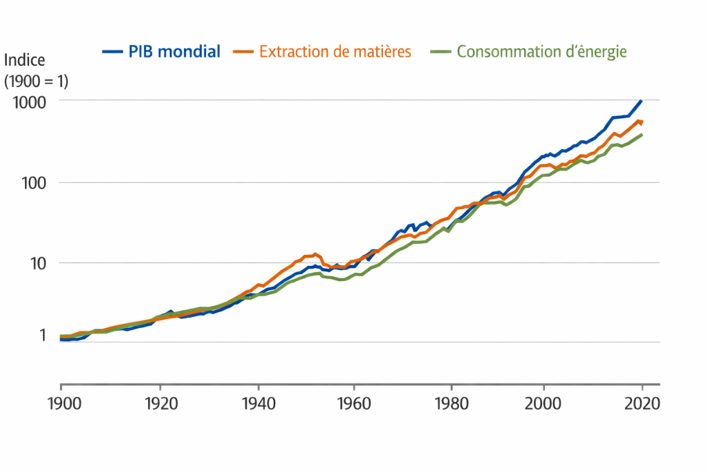 Les données du International Resource Panel indiquent que l’extraction mondiale de matières est passée d’environ 30 gigatonnes par an en 1970 à plus de 100 gigatonnes aujourd’hui ! Cette croissance est fortement corrélée à celle du PIB mondial.