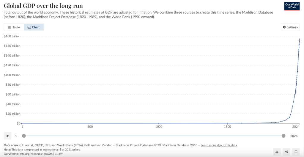 - Source : https://ourworldindata.org/grapher/global-gdp-over-the-long-run. ↩︎